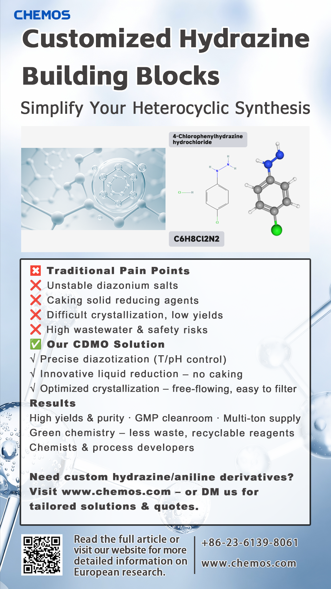 Today, we’re highlighting our optimized CDMO process for 4-Chlorophenylhydrazine hydrochloride — a versatile hydrazine derivative essential for constructing pyrazole, indole, and triazole frameworks found in many APIs and pesticide intermediates.
